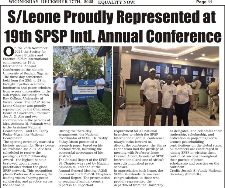 The Society for Peace Studies and Practice (SPSP) is pleased to highlight the strong and commendable participation of the Sierra Leone Chapter at the 19th SPSP International Annual Conference, held from 25th to 28th November 2025 at the historic University of Ibadan, Nigeria.