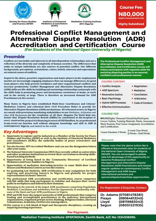The Professional Conflict Management and Alternative Dispute Resolution (ADR) Accreditation and Certification course will imbue participants with the requisite skills for assisting disputing parties in an assured, confident and professional manner.